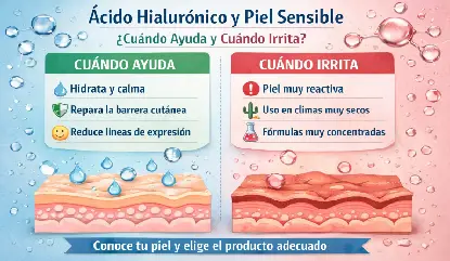 ¿Puedo usar ácido hialurónico si tengo rosácea? Sí, con precaución. El ácido hialurónico y piel sensible con rosácea pueden convivir si se elige el tipo de alto peso molecular. Evita fórmulas con alcohol, fragancias o ácido hialurónico de muy bajo peso molecular durante los brotes activos. Consulta siempre con tu dermatólogo.